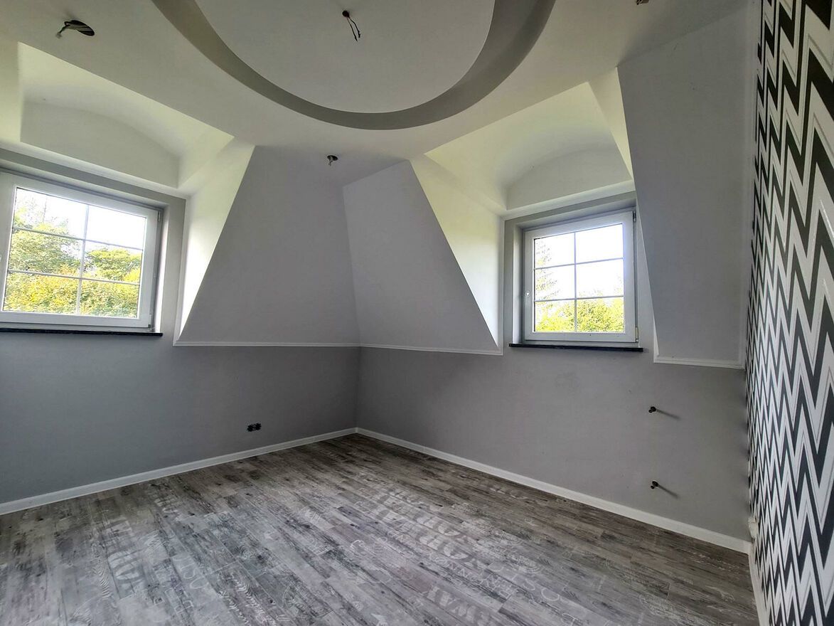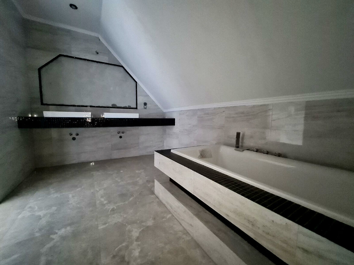 Parter: reprezentacyjny wiatrołap, korytarz, przestronny, jasny salon z wyjściem na taras idealny na rodzinny wypoczynek, kuchnia z jadalnią, pokój (gabinet/sypialnia/dla gości), toaleta. Poddasze użytkowe: cztery jasne, ustawne pokoje, łazienka z wanną, oddzielna toaleta, duży, komfortowy hall. Dom wyposażony w stolarkę okienną PCV. Instalacje doprowadzone brak jedynie montażu kotła, instalacji kotłowni i grzejników (pod grzejniki wykonano przygotowanie). W kotłowni, łazienkach i toalecie położono wysokiej jakości płytki. Schody wykończone ceramiką, ściana przy schodach pokryta dekoracyjnym tynkiem w nowoczesnym stylu.